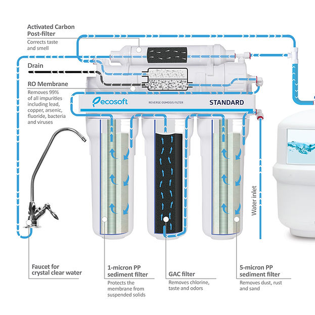 FILTRATION STAGE 1: Sediment Filter 5 micron: Removes suspended solids with a diameter greater than 5 micron i.e dirt, rust, sediments. STAGE 2: Granular Activated Carbon filter to remove chemicals. STAGE 3: Sediment Filter 1 micron: Removes suspended solids with a diameter greater than 1 micron i.e dirt, rust, sediments. STAGE 4: Ecosoft 50 GPD semi-permeable membranes. Due to the special semi-permeable membrane, sufficient drinking water can be purified of all kinds of harmful impurities, including viruses and bacteria. RO membrane pores are 200 times smaller than viruses, and 4000 times smaller than bacteria. STAGE 5: Post Carbon "In-Line" filter with mineralization that removes chlorine taste, odors and organic chemicals that contribute to bad taste.